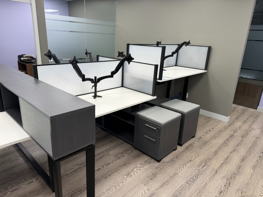 We implemented a low-height divider panel system in an open benching configuration. The new workstations are slightly smaller than the previous desks, but they make far better use of the space, allowing us to comfortably fit six positions while improving overall flow.